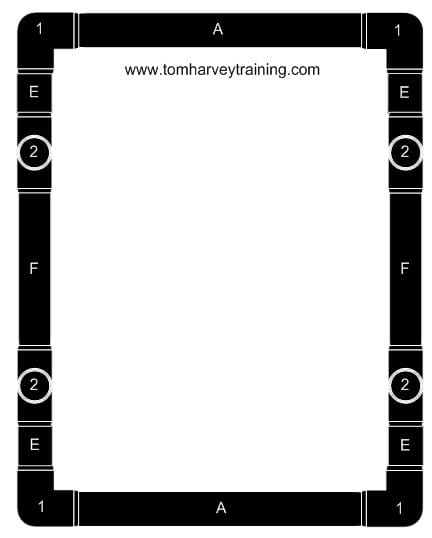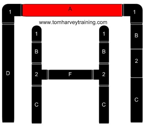 Shows the H‑frame structure with labeled zones A–F and joint types (1 = elbow, 2 = tee).
